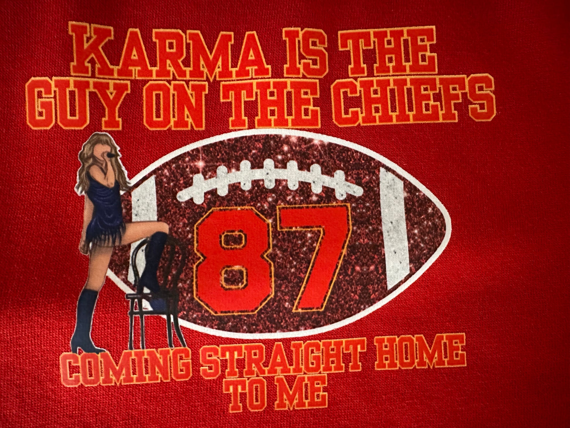 Karma is the guy on the Chiefs Sweatshirt! Super cute design with faux sequin effect. Shown with red cropped sweatshirt. Available for other styles/colors.